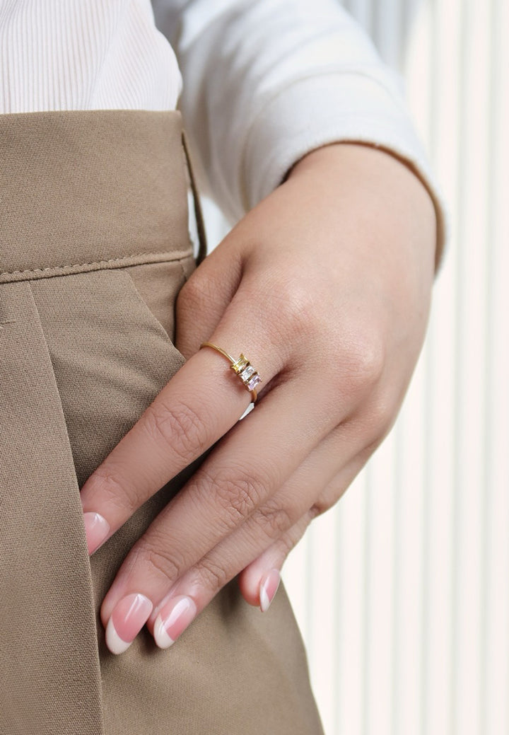 With three radiant cubic zirconia stones in soft hues of blush pink, sparkling clear, and warm champagne, this ring brings a subtle prism of color to your look. The gold band’s slender, minimalist design enhances the delicate beauty of the stones, perfect as the finishing touch to your outfit.