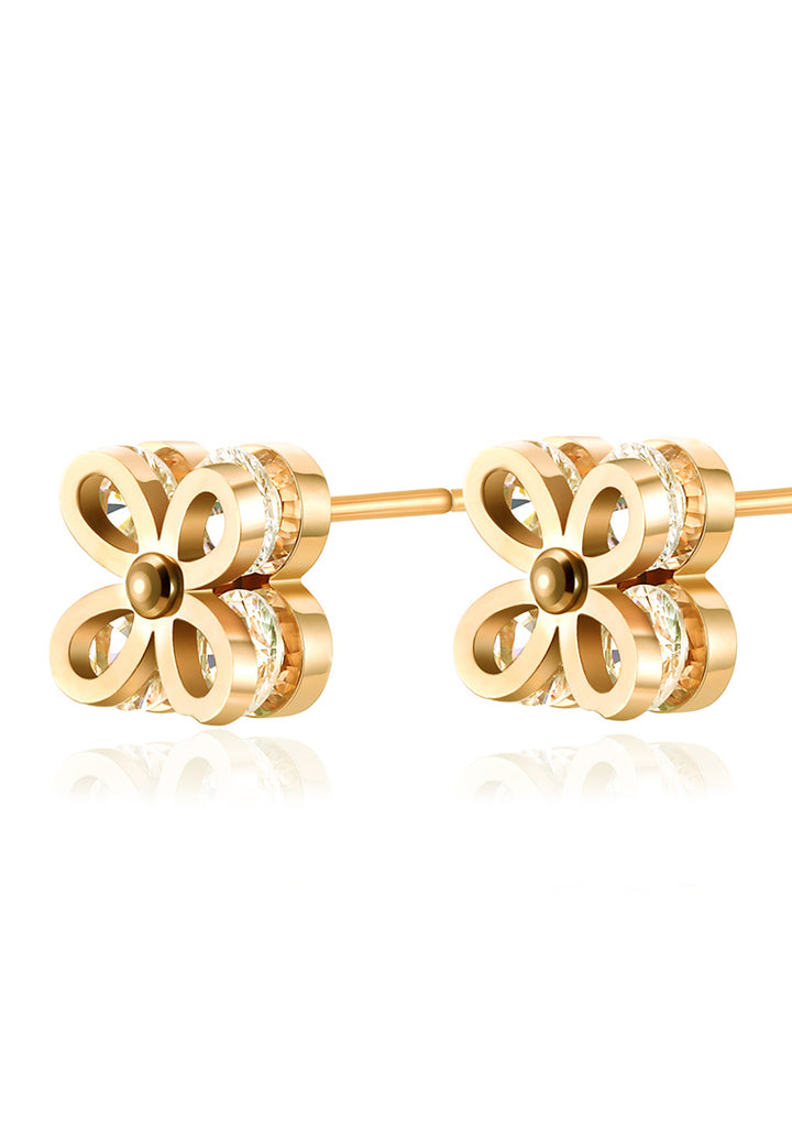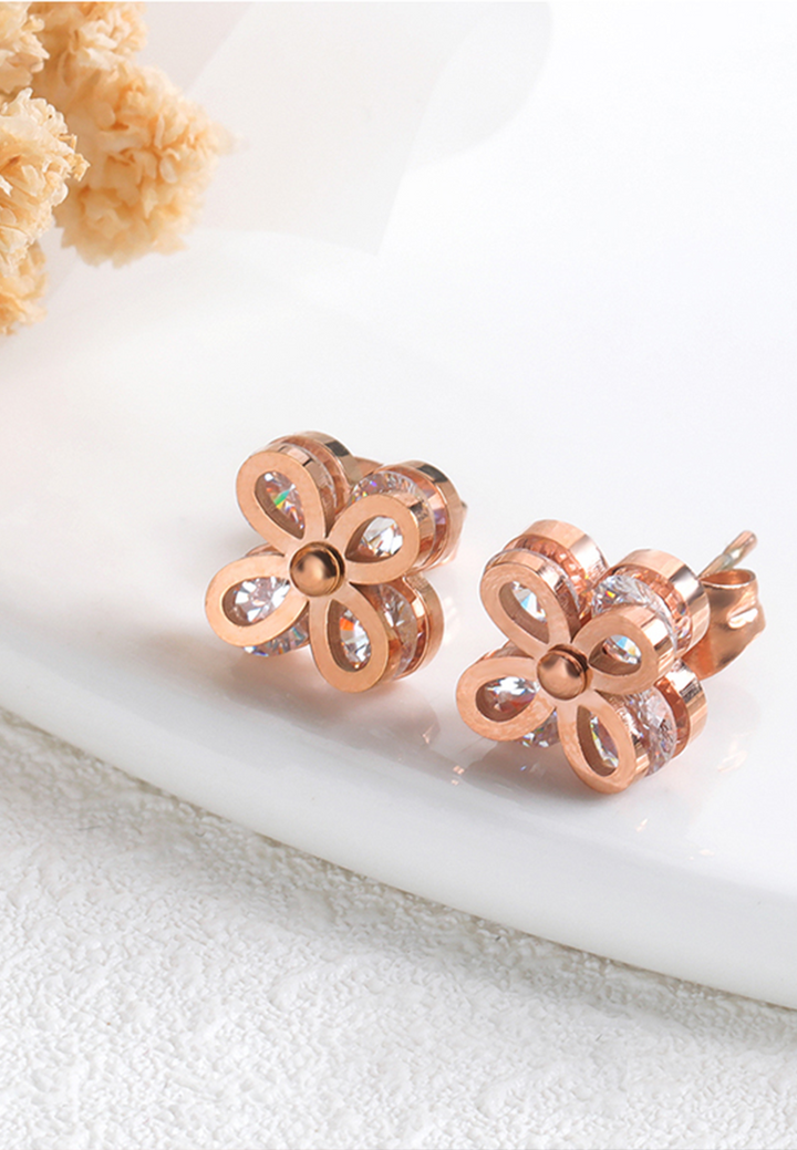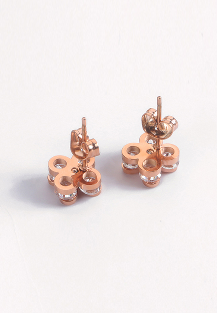 Cleo Dainty Four Leaf Clover with Cubic Zirconia Petal Flower Stud Earrings in Rose Gold