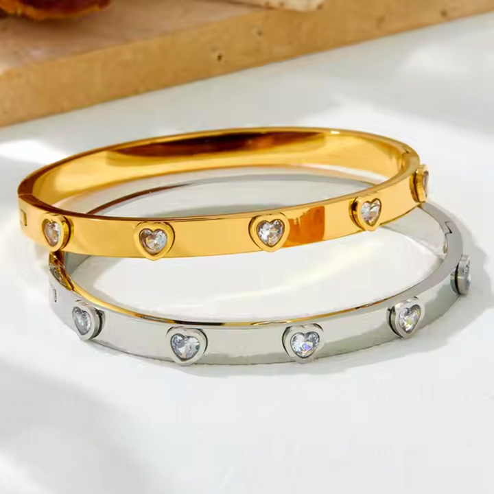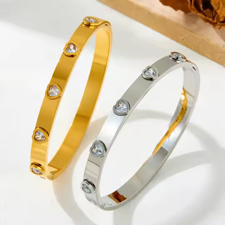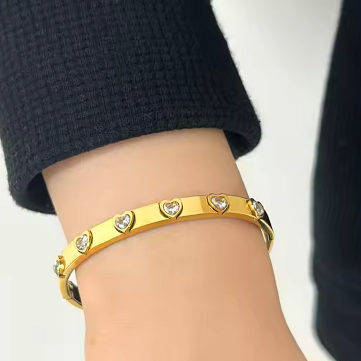 This bangle beautifully captures the essence of love's gentle rhythm. Featuring a delicate sequence of heart-shaped cubic zirconia stones, each cradled in a sleek rose gold setting, this bangle mirrors the heartbeat of affection and care. The refined design makes it a versatile addition to any outfit, enhancing your look with a subtle sparkle that resonates with the warmth of heartfelt connections.