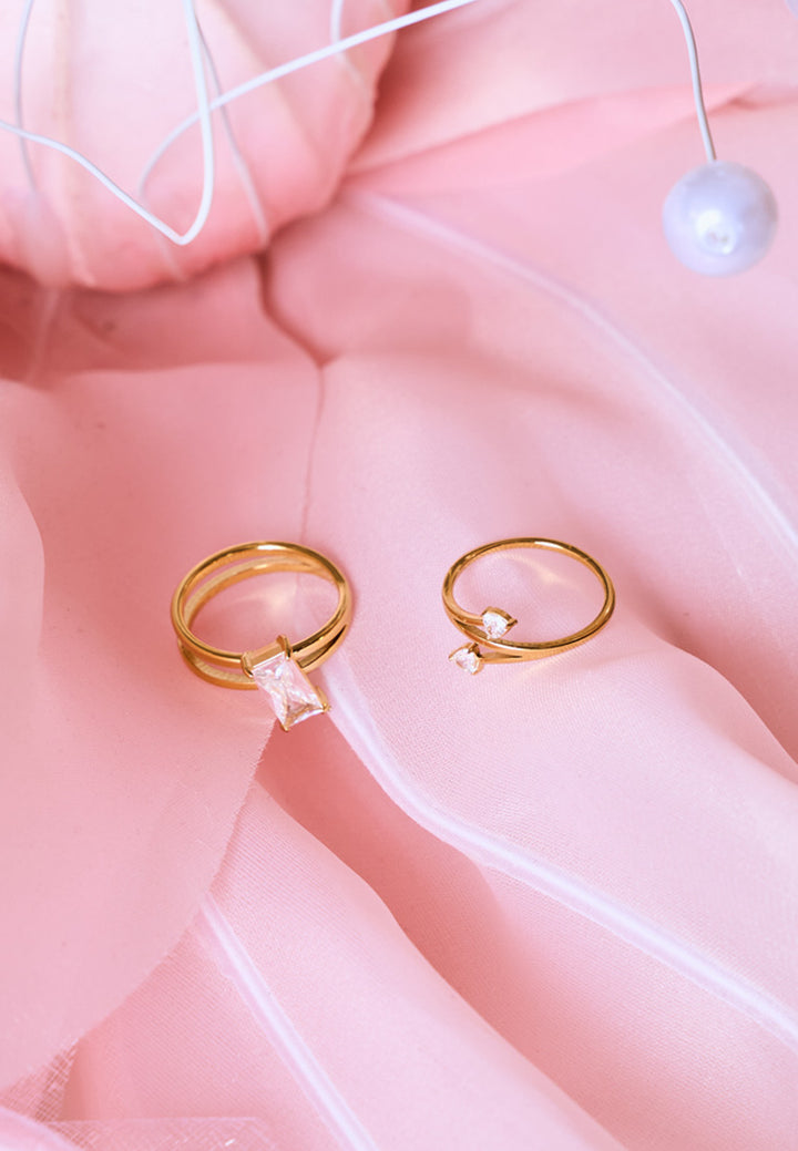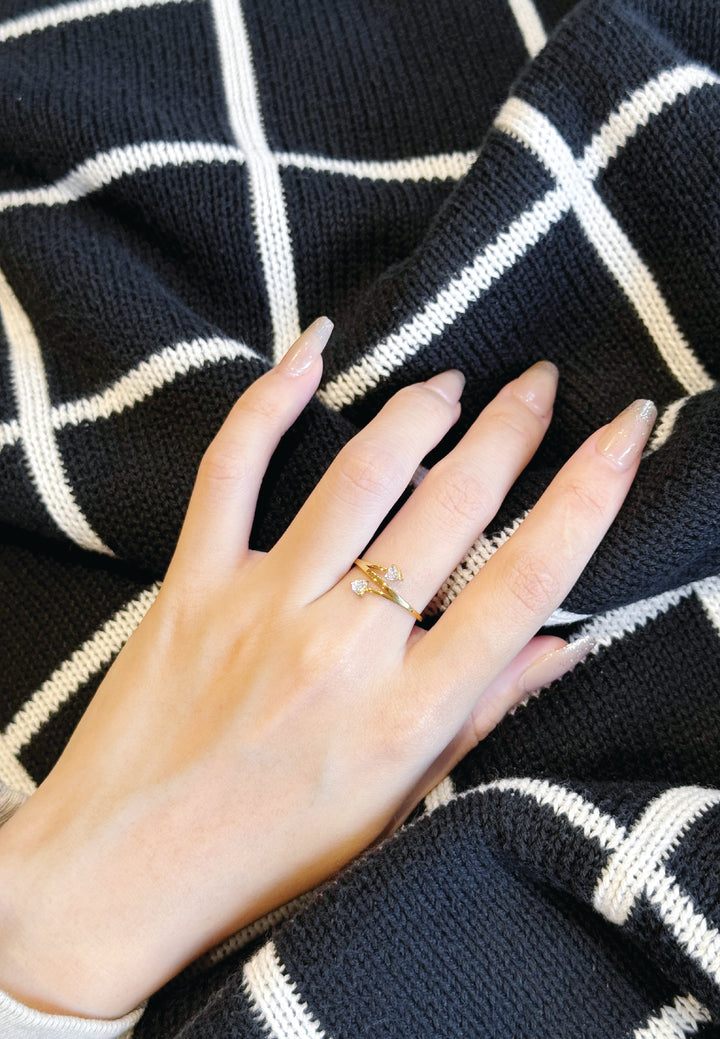 This ring encapsulates the allure of duality in its design. Crafted with a sleek band that splits into two elegant paths, each arm of the ring is crowned with a shimmering cubic zirconia, symbolizing the merging of two distinct yet interconnected paths. This artistic representation of convergence and divergence echoes the essence of life's twin journeys — the personal and the shared.