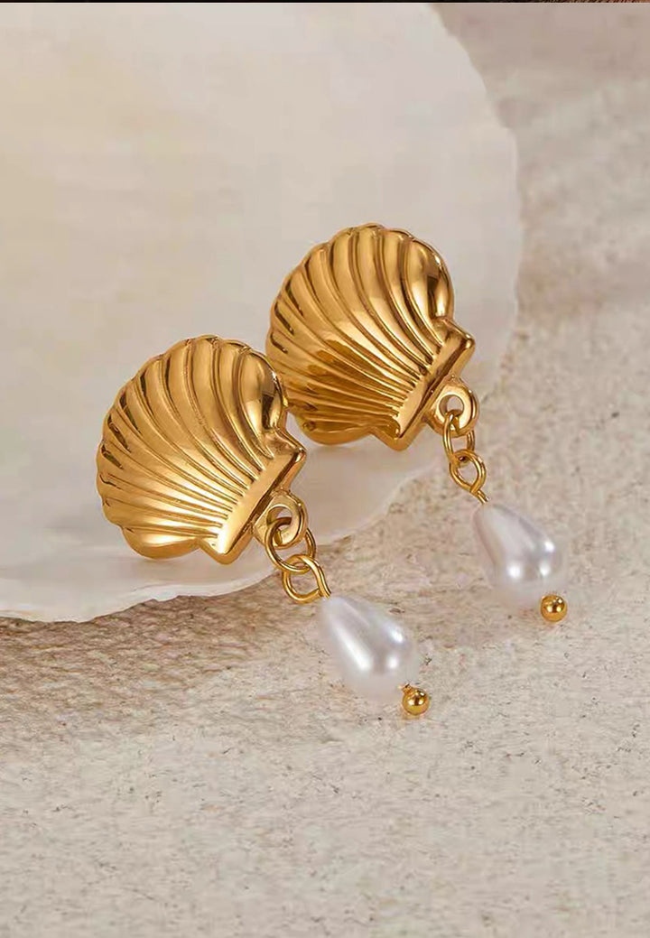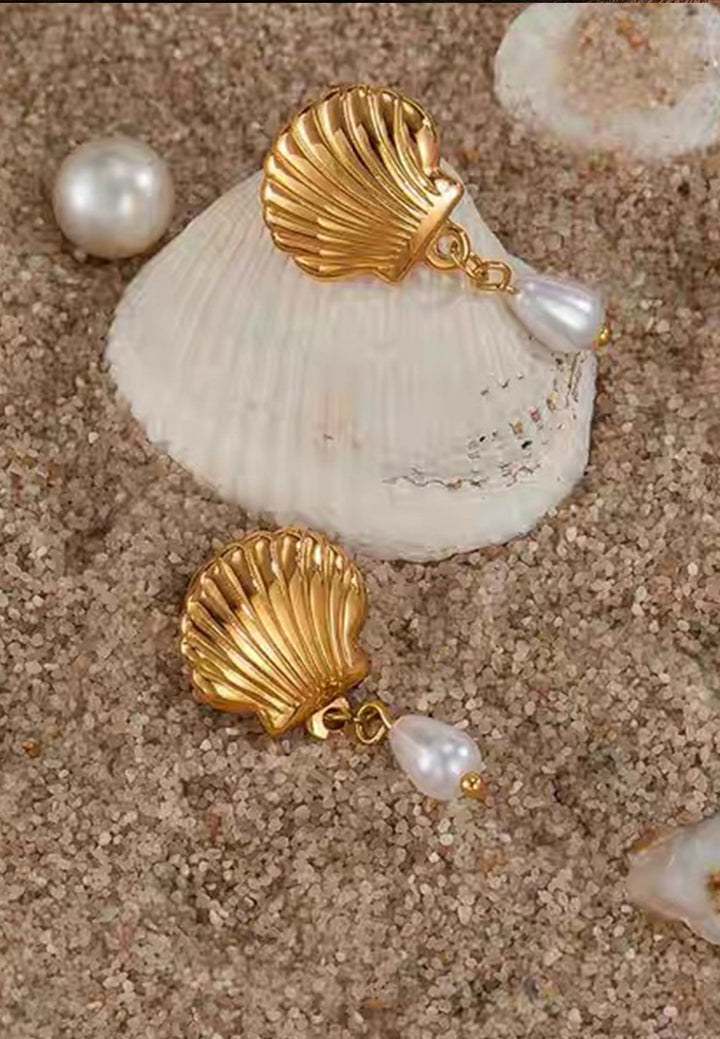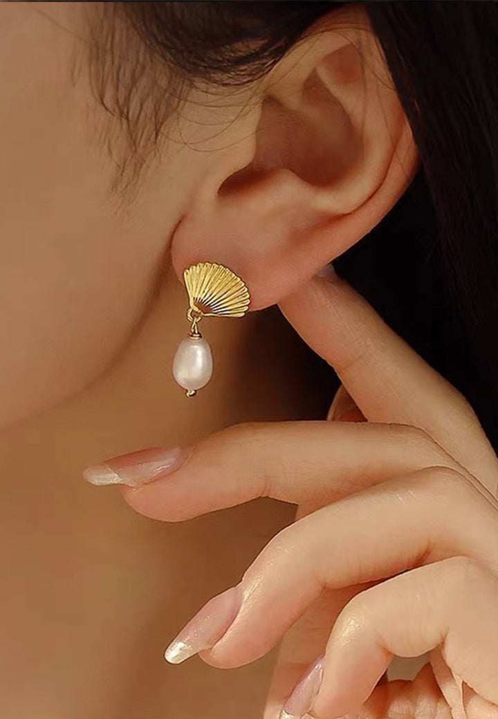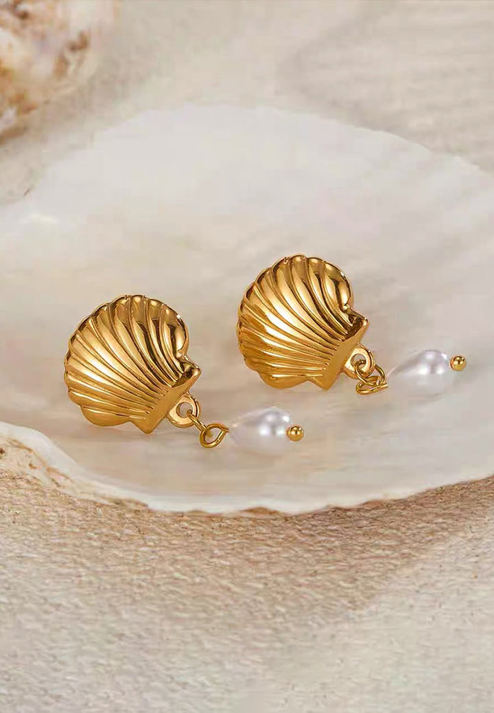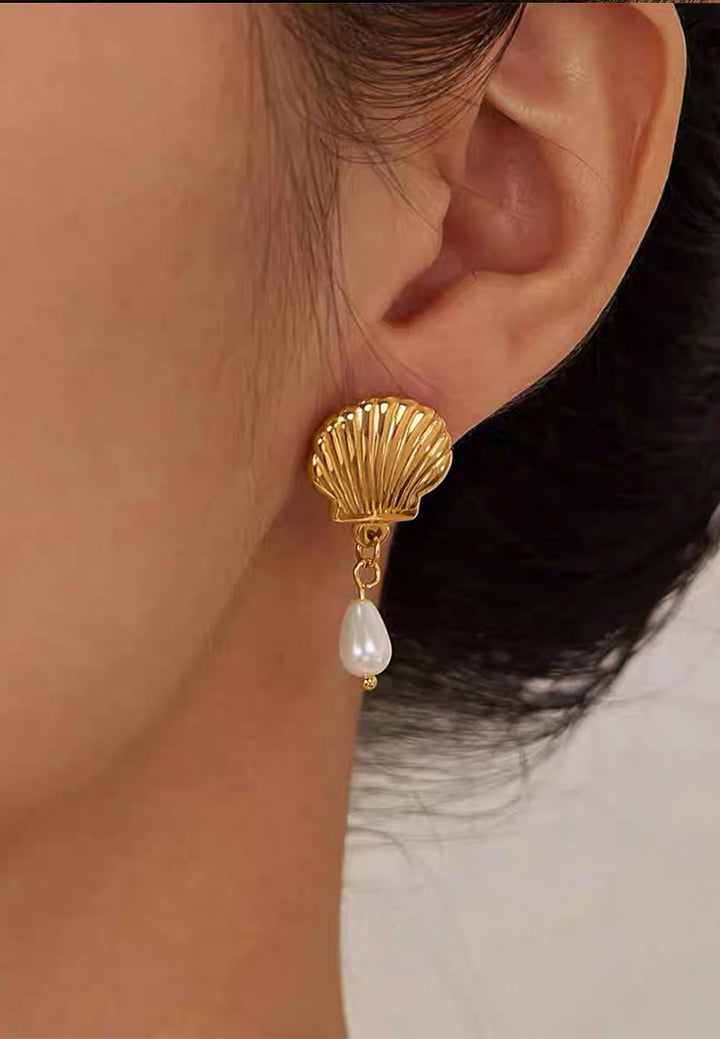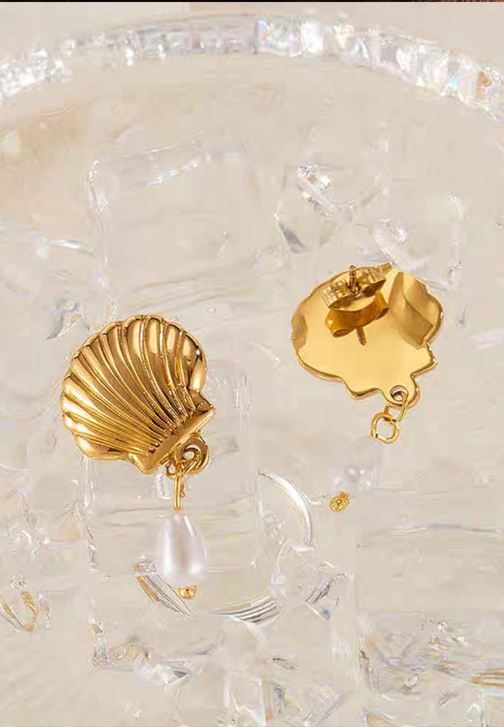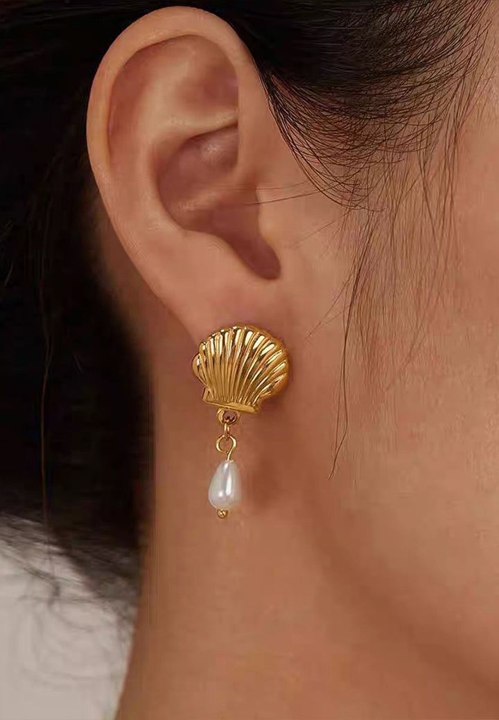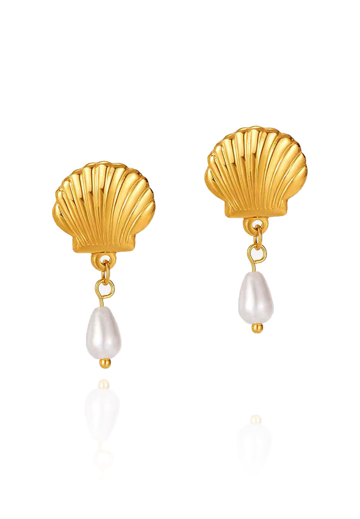 The Marina earrings capture the magic of seashells washed ashore. Each earring is crowned with a delicate shell motif, complemented by a dainty pearl drop, symbolizing purity and grace.