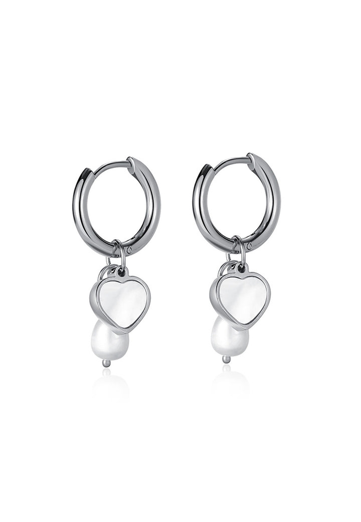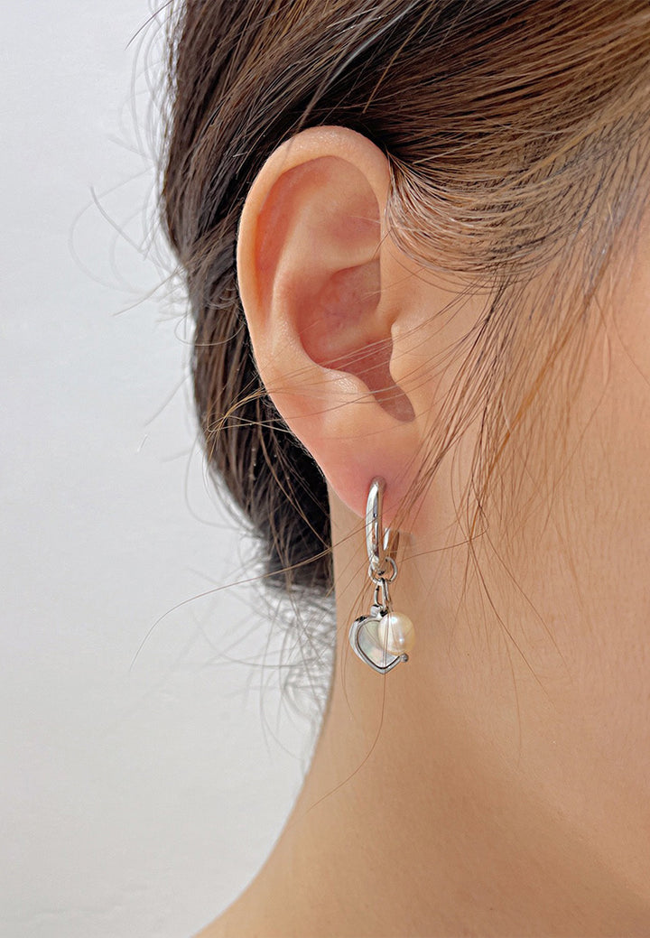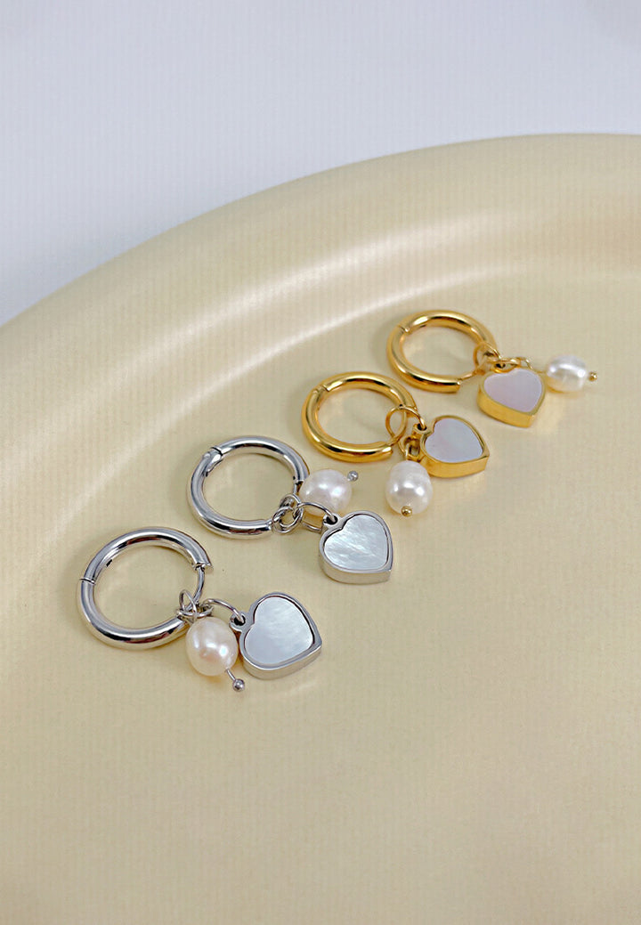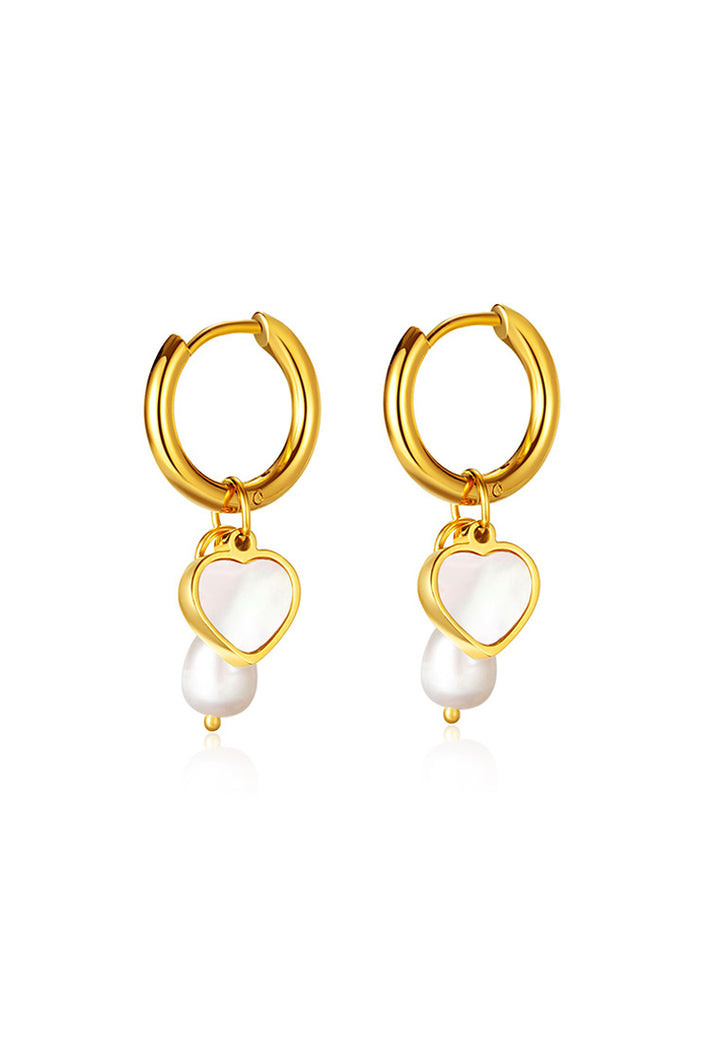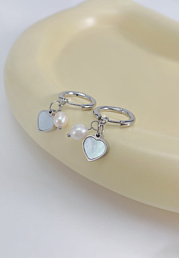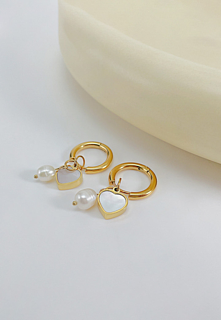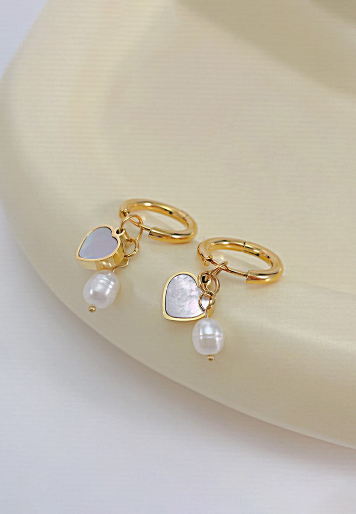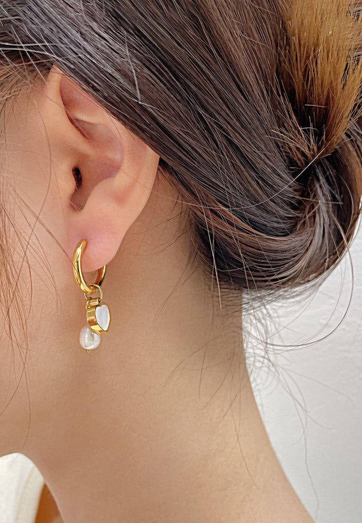 These earrings feature polished hearts adorned with mother of pearl inlays, each elegantly framing a luminous pearl drop. The design seamlessly combines traditional elegance with contemporary design elements, making it a versatile accessory perfect for adding a touch of sophistication to any ensemble.