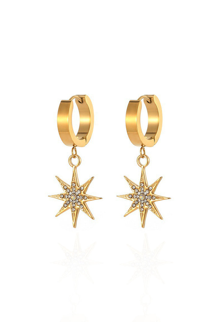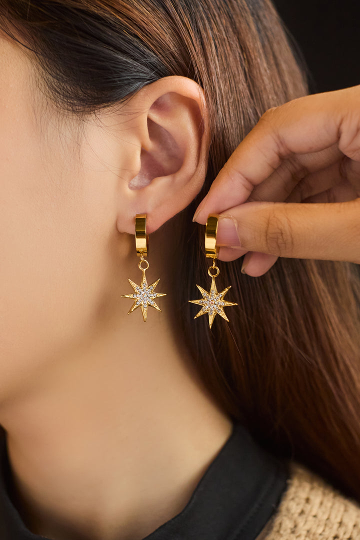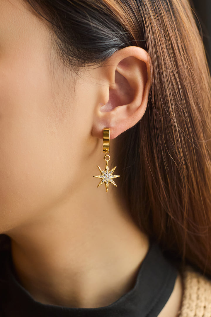 These dazzling earrings feature a polished gold finish and a sparkling starburst charm that captures light beautifully. Designed to add a celestial touch to any look, these earrings dangle gracefully, enhancing your features with their radiant glow. Shine bright like the star you are meant to be.
