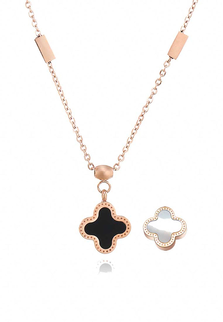 Adele Reversible Clover Pendant with White Mother Pearl and Black glossy finish on each side, in Rose Gold Bar Link Chain Necklace.