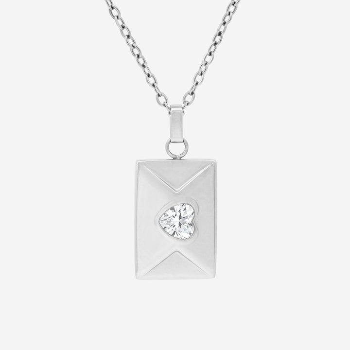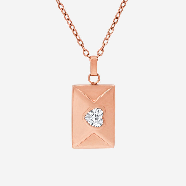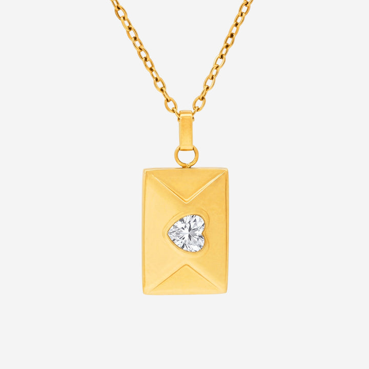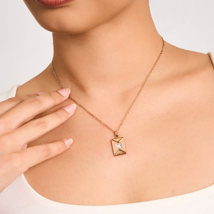 Amie takes the shape of a delicate envelope, symbolising heartfelt messages and cherished memories. At the centre, a heart-shaped cubic zirconia is nestled within, capturing the sparkle of emotions that words alone cannot convey. The clean geometric folds of the pendant evoke the timeless charm of a letter, while the polished gold finish lends a radiant warmth.