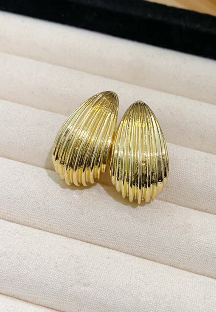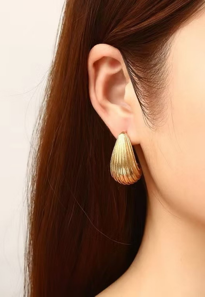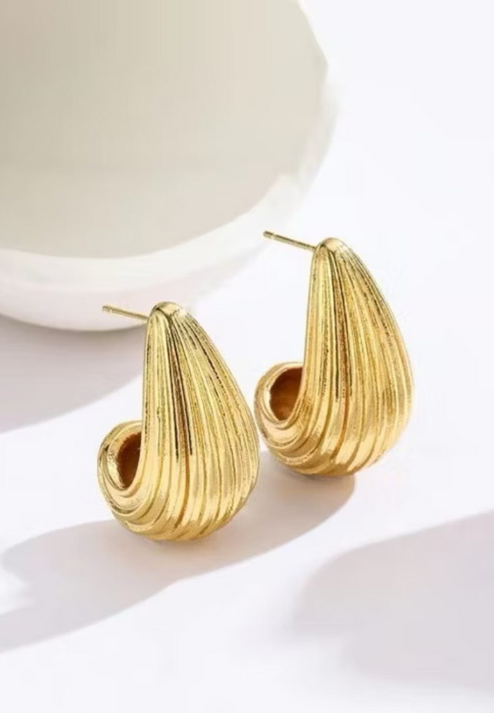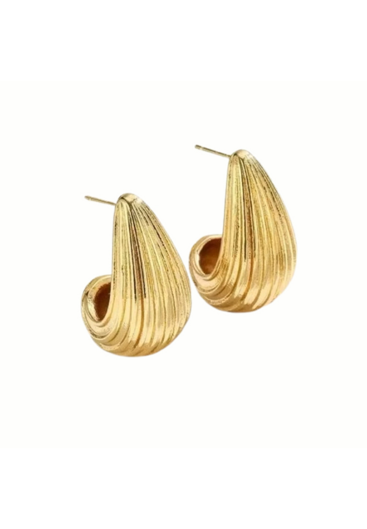 These earrings showcase an elegant teardrop silhouette with fluid, overlapping lines that create a look of gentle flows. The textured surface catches and reflects light beautifully, making these earrings a standout accessory for any sophisticated occasion. Ideal for those who embrace bold, artistic expressions in their style, the Dorine Earrings bring a dash of avant-garde elegance to any look.
