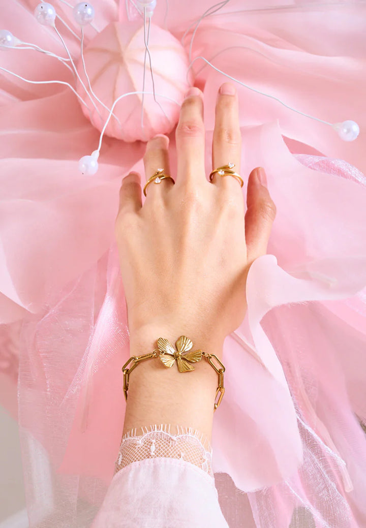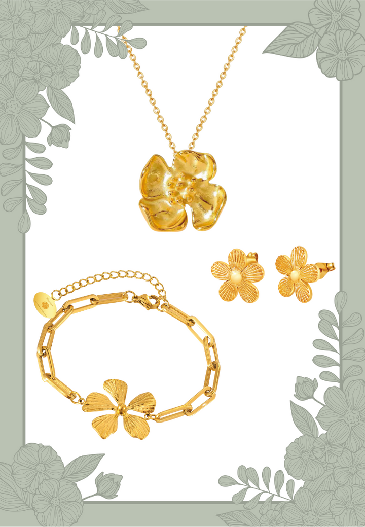 Designed for those who love a soft yet statement-worthy touch, the intricate floral motifs add a sense of charm and refinement, while the gold finish enhances its luxurious appeal. Whether worn together for a coordinated, sophisticated look or styled individually, this set effortlessly elevates any outfit.