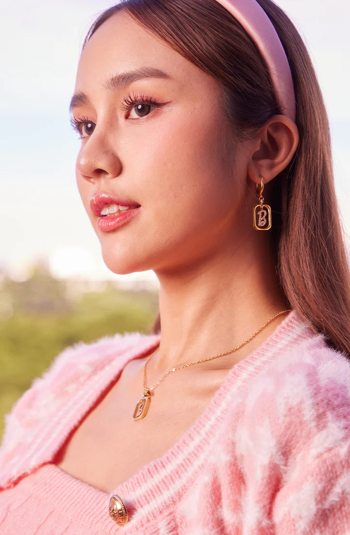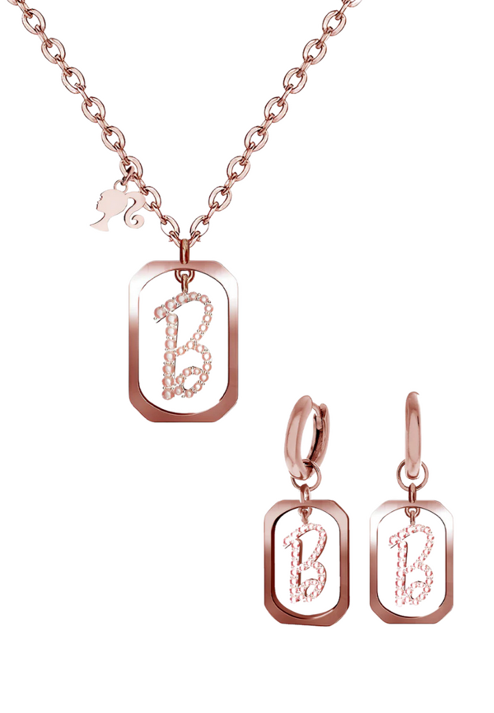 Elevate your style with the Iconic B Pendant Set, a dazzling fusion of elegance and individuality. This exclusive set features a stunning necklace and a pair of captivating hoop dangle earrings, both adorned with the iconic "B" design and a mesmerizing pink cubic zirconia stone—symbolizing love, passion, and grace.