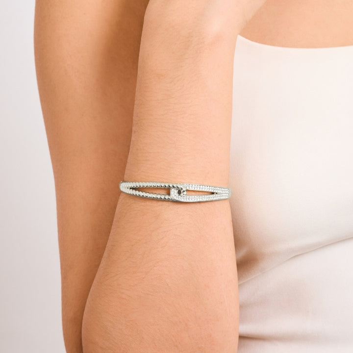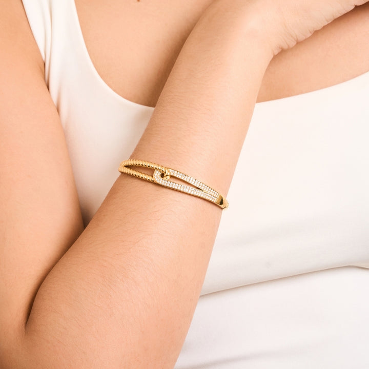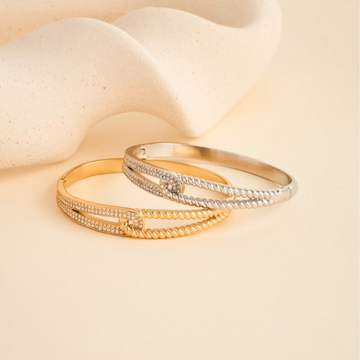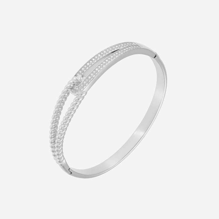 Defined by its artful fusion of texture and brilliance. Its dual-band design intertwines a twisted rope structure with a sleek zirconia-studded arc, symbolising the strength found in balance, one side representing grounded poise, the other radiant confidence. The Isalyn Bangle is a statement of unbreakable grace for the woman who moves through life with purpose and allure.