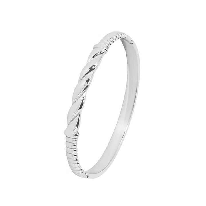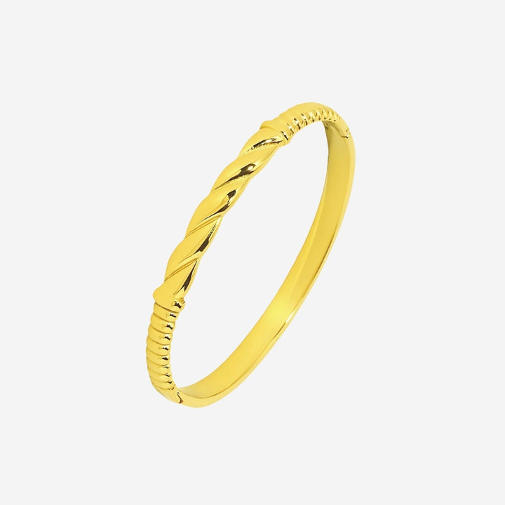 This bangle showcases a unique twisted design that blends contemporary style with classic appeal. Each twist and turn of the bangle creates a subtle yet captivating reflection of light that enhances any outfit. The bangle's sleek and smooth finish ensures it rests comfortably around the wrist, making it perfect for daily wear or special occasions.
