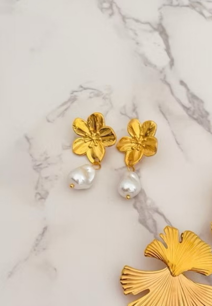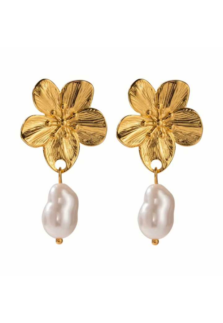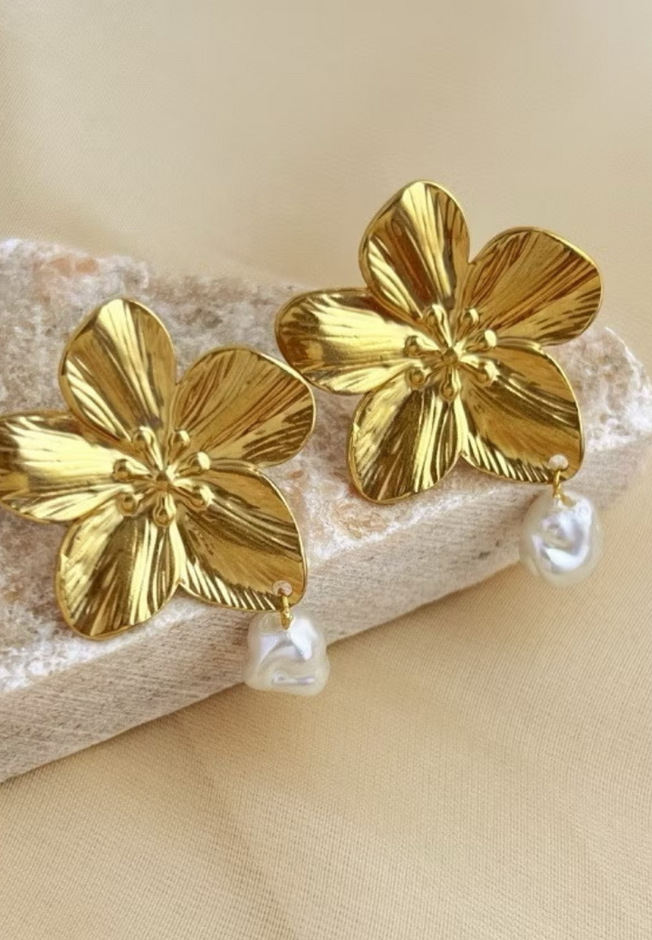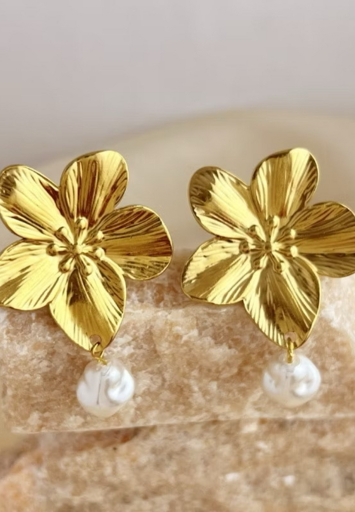 Each earring features a beautifully crafted gold flower, textured to capture the natural allure of blooming petals, from which a lustrous pearl gracefully dangles. These earrings blend the timeless elegance of pearls with the enchanting beauty of floral designs, making them perfect for adding a touch of sophistication and natural charm to any outfit.