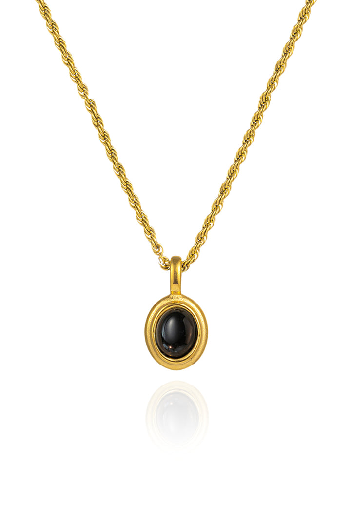 This necklace features an alluring oval black stone set in a golden frame, offering a touch of elegance and mystery. Its slender chain enhances any neckline, perfect for those seeking a blend of simplicity and sophistication. Feel the warmth and allure of timeless style with every wear.
