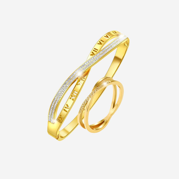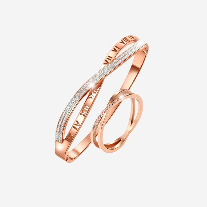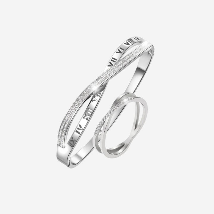 Celebrate the beauty of time and brilliance with the Vera Reva Timeless Spark Set, a refined duo that symbolizes resilience, elegance, and everlasting radiance. This stunning set features the Vera Roman Numeric with Dias Bangle, a tribute to time’s significance with its sleek Roman numeral engravings, and the Reva Entwined Cubic Zirconia Ring, representing the beauty of intertwined connections.