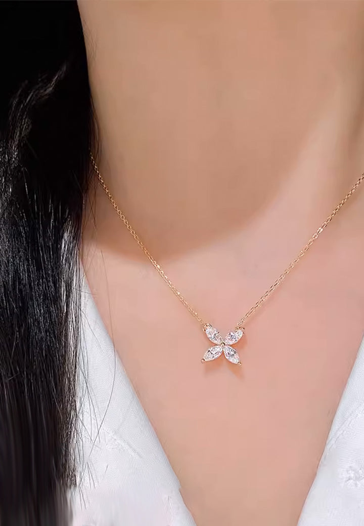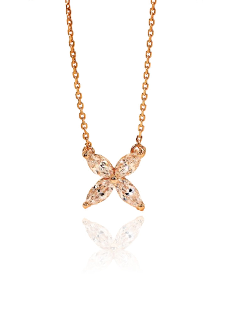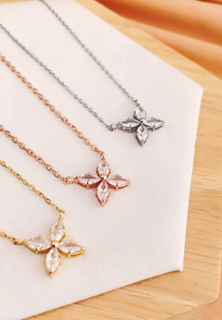 A chain necklace with a zirconia pendant shaped in the Ixora flower. The four-petaled flower boasts a timeless aesthetic that easily complements any look you have in mind.