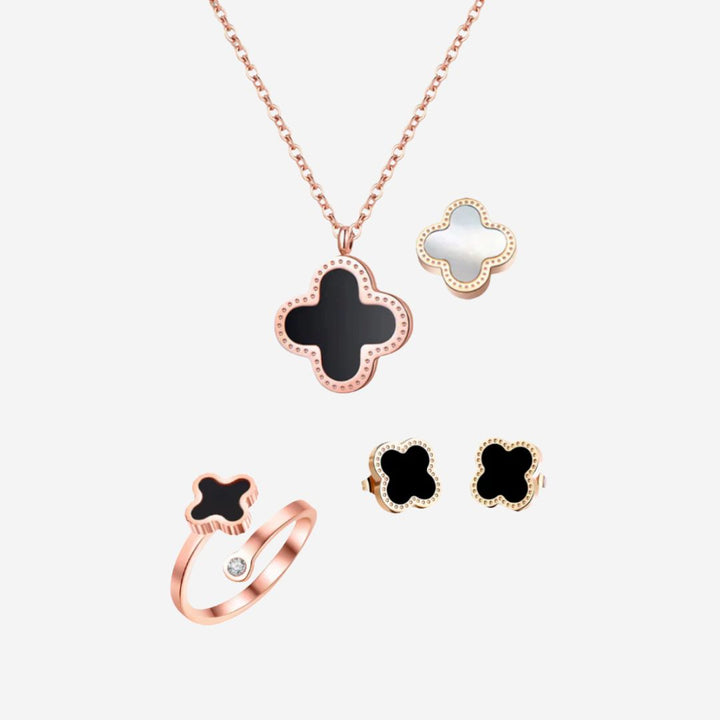 Embrace timeless elegance with the Adele Clover Blessings Set, a beautifully crafted trio designed to bring luck, love, and sophistication to your jewellery collection. Featuring the Adele Four Leaf Clover Stud Earrings, the Adele Reversible Two-Side Four Leaf Clover Pendant Necklace, and the Adele Four Leaf Clover Adjustable Ring, this set embodies the charm of the iconic four-leaf clover—a universal symbol of fortune and positivity.