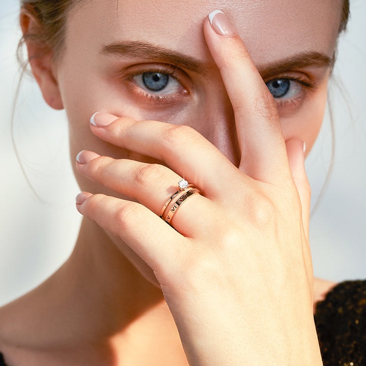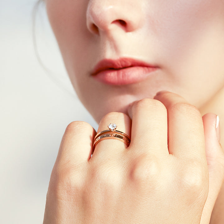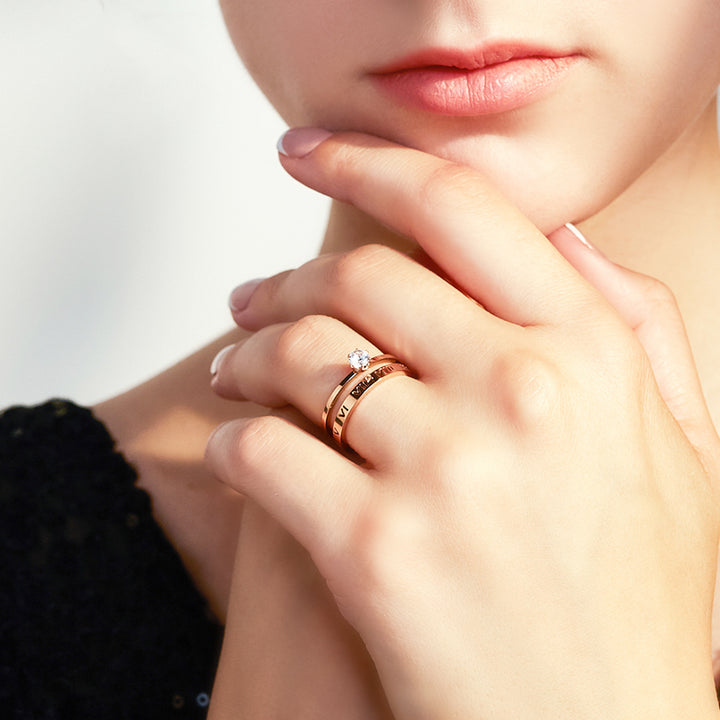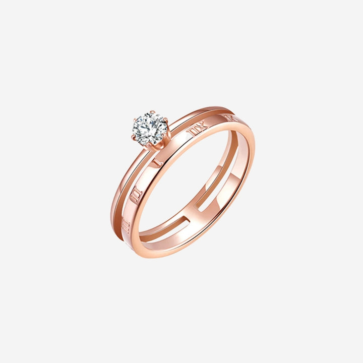 精心制作的双带罗马数字玫瑰金戒指。戒指的中心镶嵌着一颗氧化锆单石,象征着勇敢、闪耀自己的光芒。