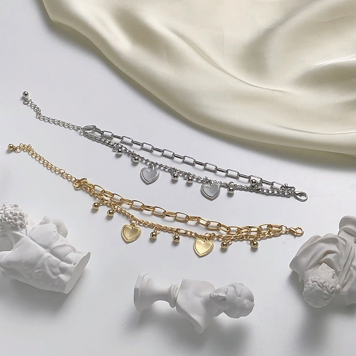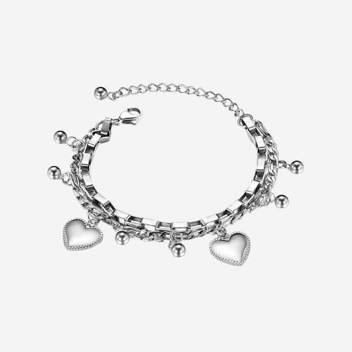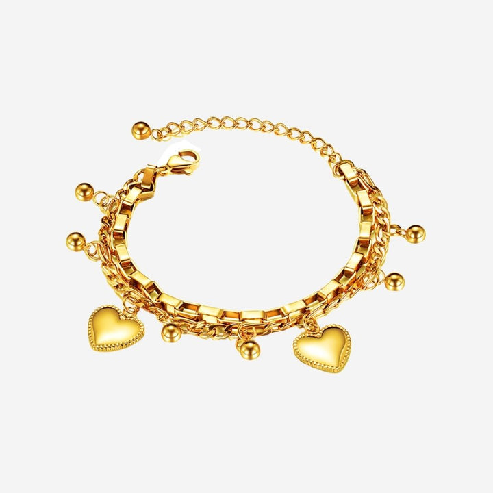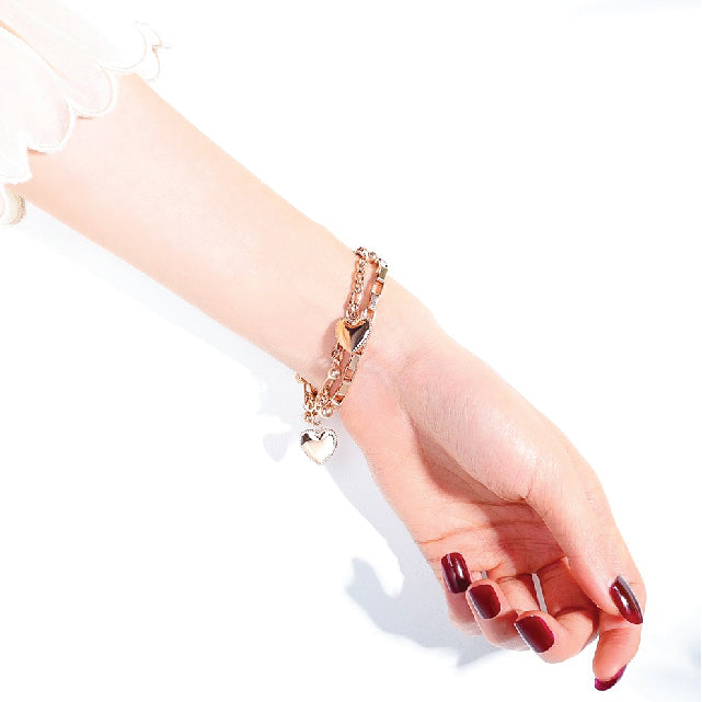 多层链式手链,饰有珠子和心形吊饰。这款手链无需将多件手链分层叠戴,而是一种绝佳的选择,同时还能带来优雅的触感。