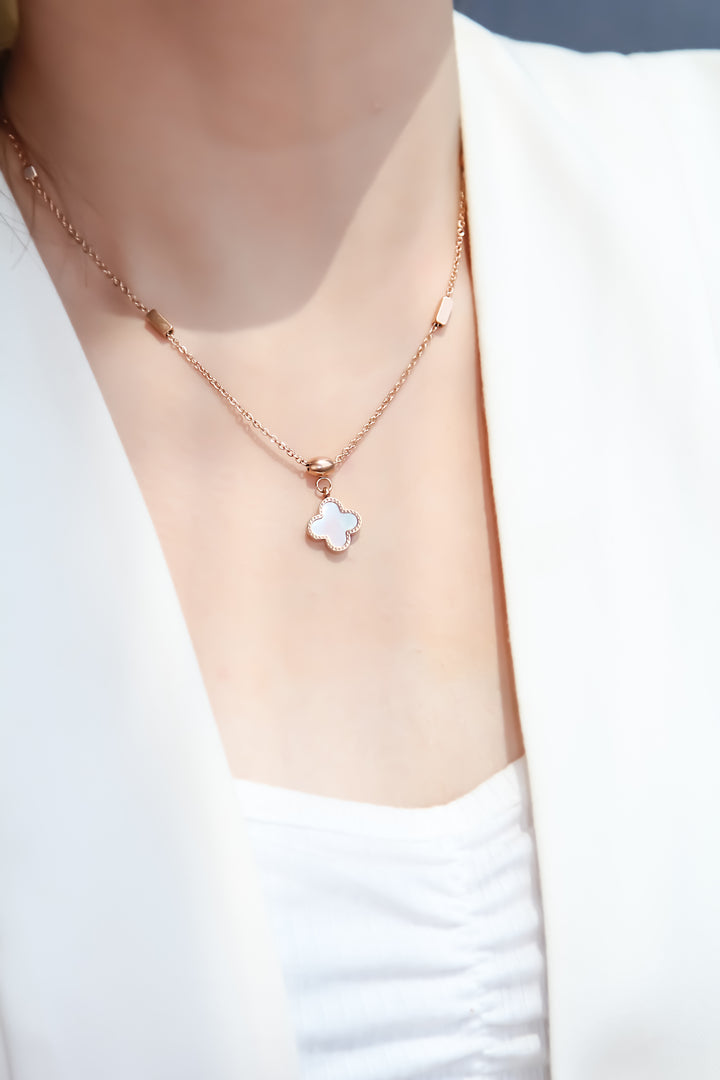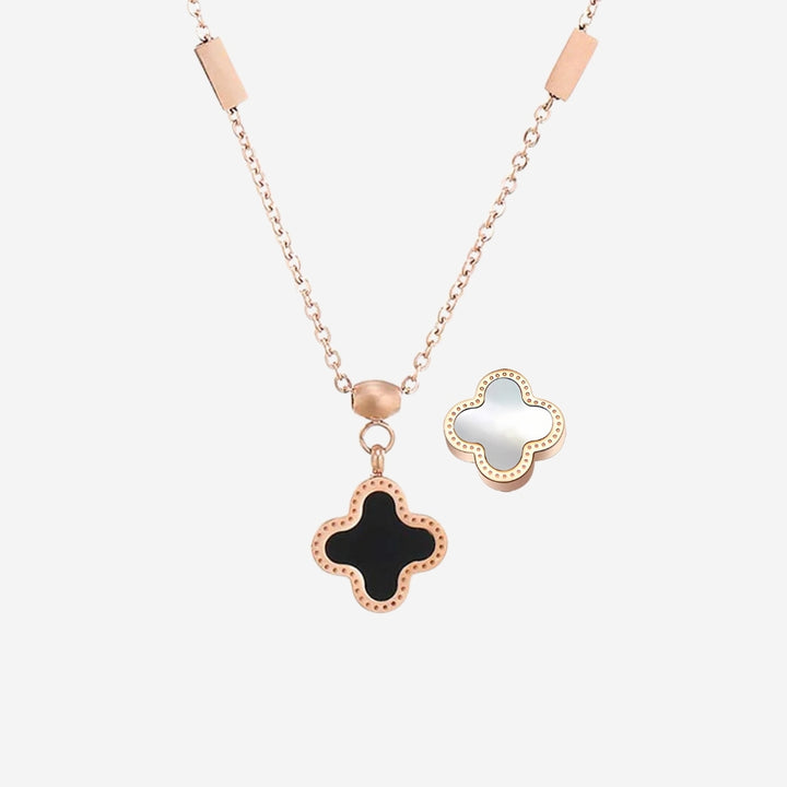 Adele 双面三叶草吊坠,两侧饰有白色珍珠母贝和黑色光泽饰面,采用玫瑰金条状链式项链。