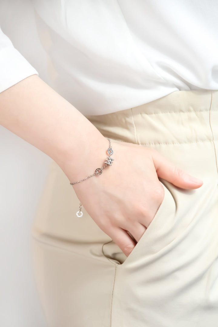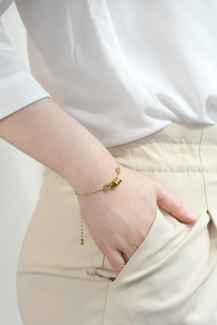 精致的链式手链以其标志性的锯齿状桶形吊坠凸显特色。两侧饰有数字链节,给人一种平衡感,进一步提升了优雅感。适合任何场合的绝佳选择。 珠宝细节 链条总长度:150mm + 40mm(延长) 吊坠尺寸:8mm(长)×7mm(宽) 颜色: 玫瑰金/银色/金色 材质:进口钛 电镀:18K玫瑰金/18K金...