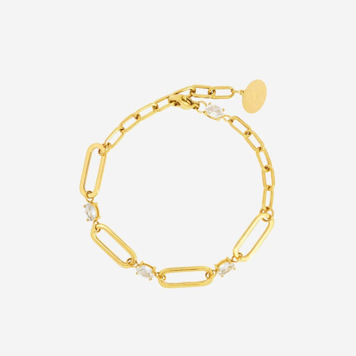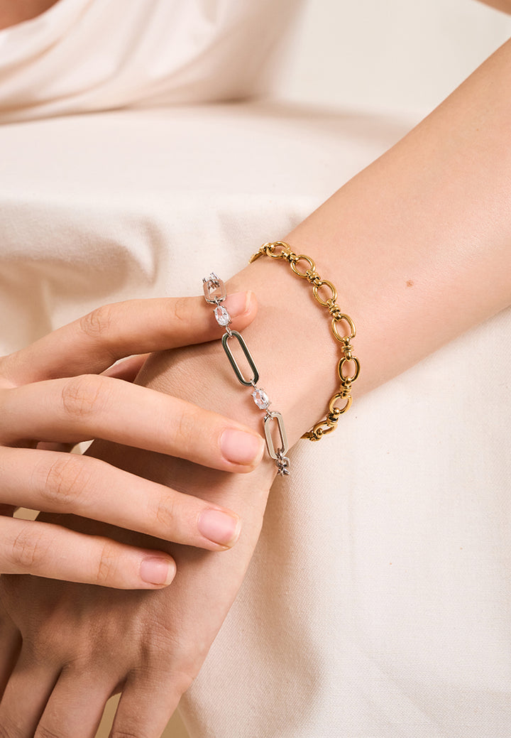The Haley bracelet reimagines everyday elegance with alternating elongated links and precision-cut 5A cubic zirconia gems. It represents the rhythm of resilience — moments of shine followed by open space, just like the emotional pace of a woman’s journey.