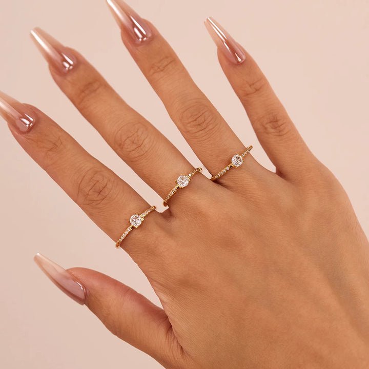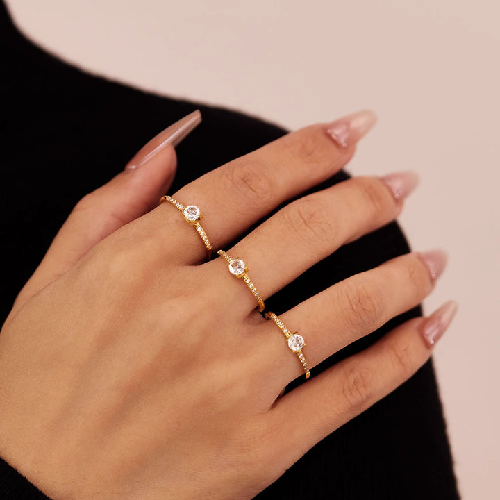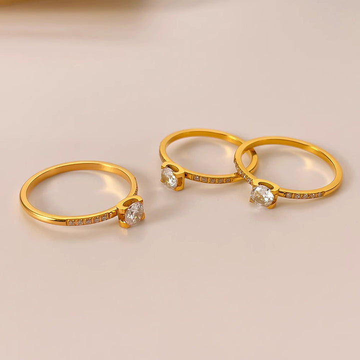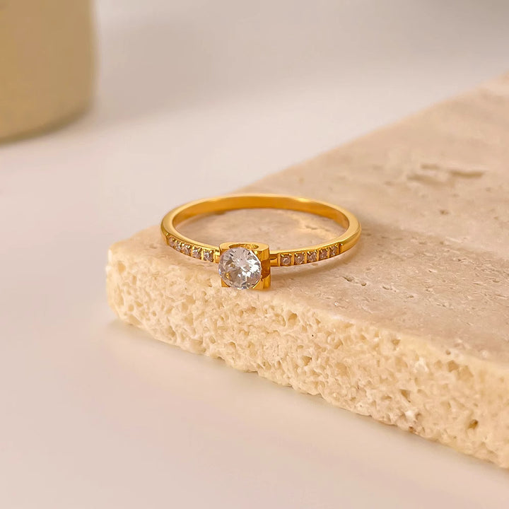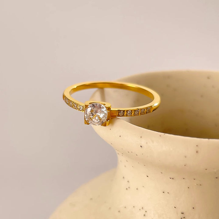 A radiant embodiment of confidence and clarity, this ring features a classic band embellished with a central round-cut cubic zirconia and smaller stones along the band. Its polished gold finish and elegant setting make it a versatile choice for daily wear or special occasions.