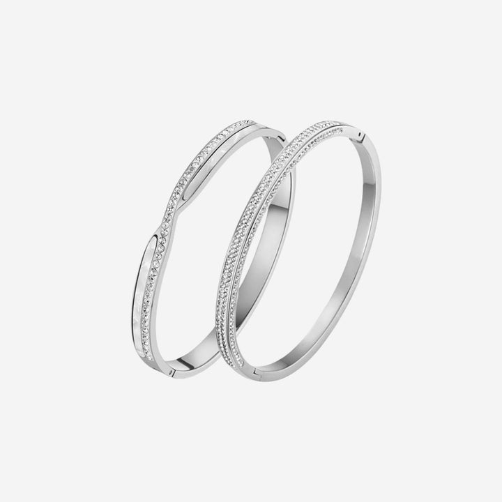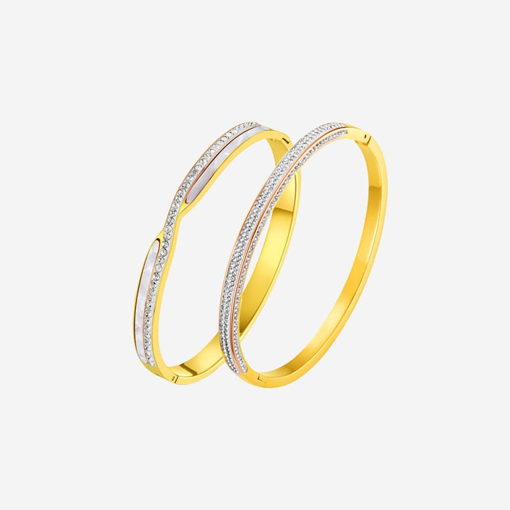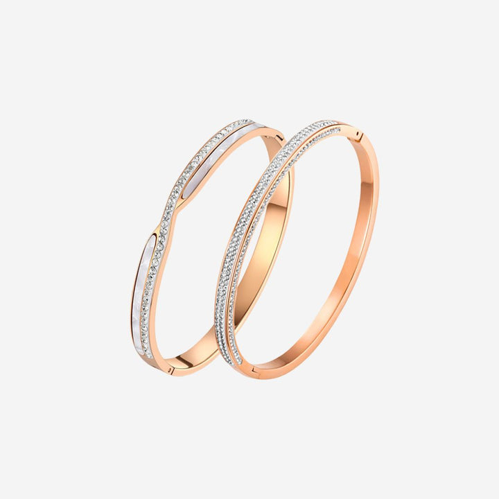 Refined and radiant, the Marilyn Claudette Luxe Set is designed for those who appreciate sophisticated glamour with a personal touch. This exquisite pairing features the Marilyn Encircling Band of Zirconia Closed Hinged Bangle, adorned with a continuous shimmer of cubic zirconia, and the Claudette Mother of Pearl with Cubic Zirconia Engravable Bangle, blending natural iridescence with brilliant sparkle.