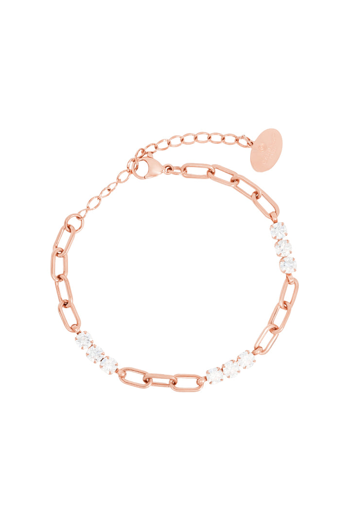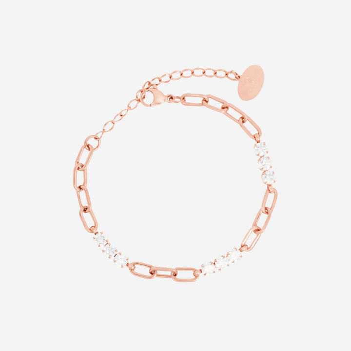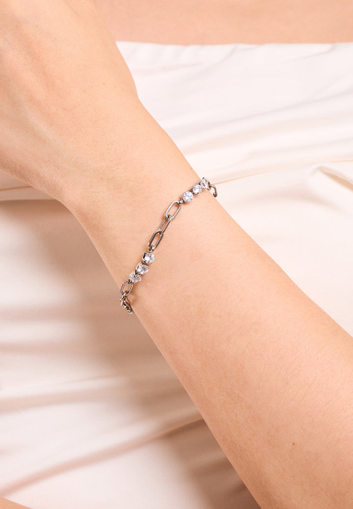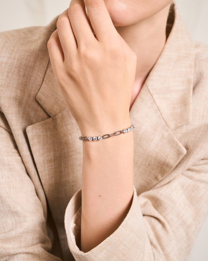 Some days, you shine for others. Some days, you need a little light yourself. This piece is for both. Designed with alternating links and pavé-set 5A cubic zirconia, this bracelet brings structure and softness into perfect harmony. The sleek elongated chain links ground the design in strength, while the dazzling zirconia clusters add light and motion to every flick of your wrist.