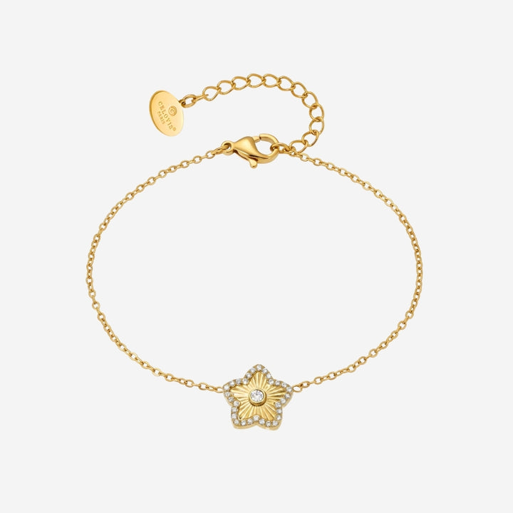The Reve Bracelet draws inspiration from the quiet poetry of a starlit bloom, radiant, graceful, and full of wonder. Encircled by a halo of glittering zirconia stones, the bracelet’s centrepiece shimmers with a brilliant gem, mirroring a star cradled in a night sky. The surrounding details evoke harmony and movement, bringing depth and dimension to its refined design.