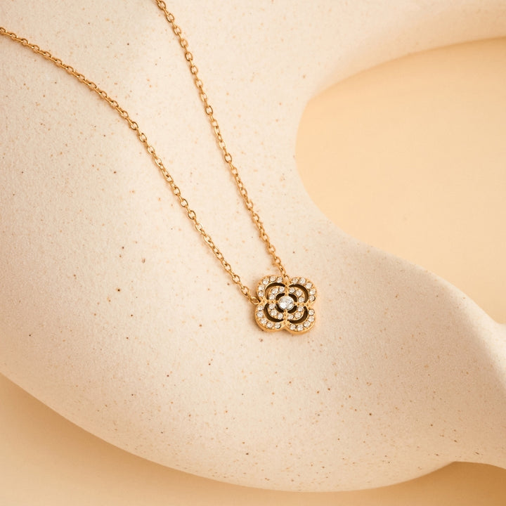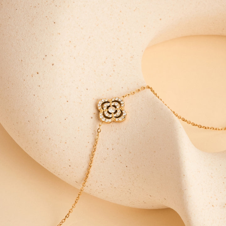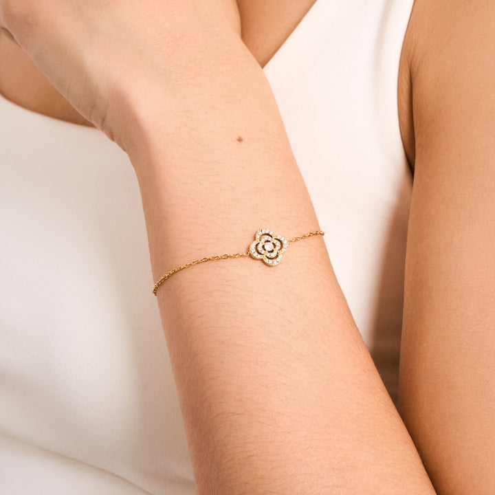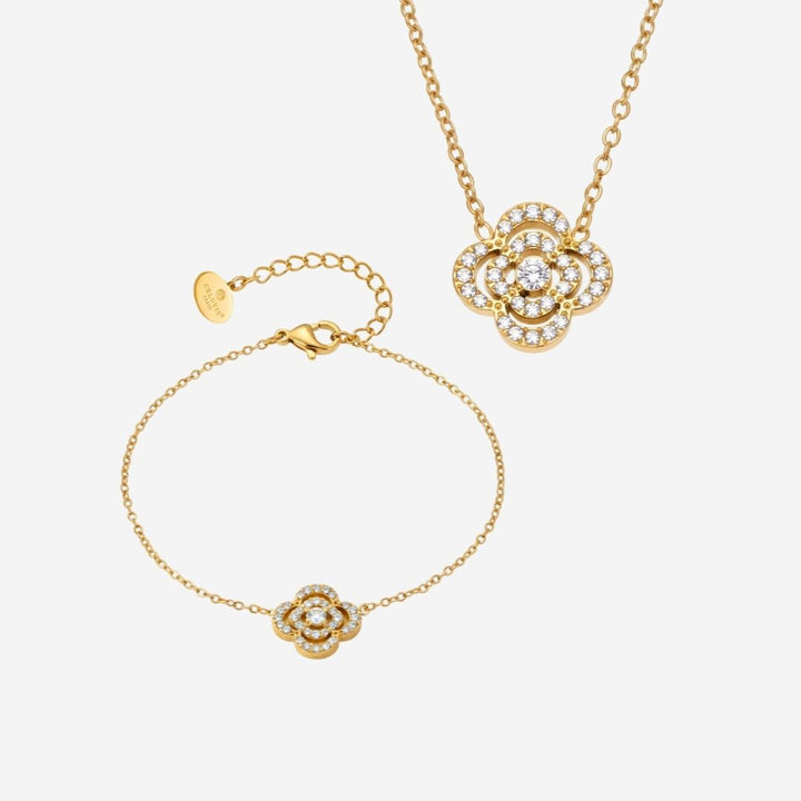 The Rosee necklace and bracelet blossoms with elegance, inspired by the soft symmetry of a blooming flower captured in radiance. With its graceful fluidity the composition evokes a sense of renewal and femininity, a quiet reminder of grace that endures through every season.