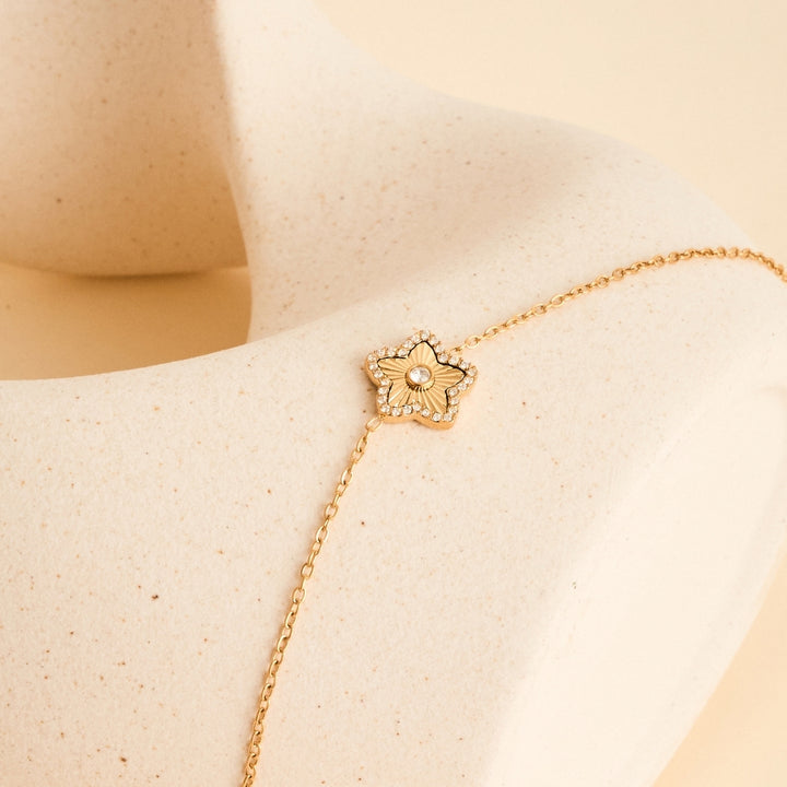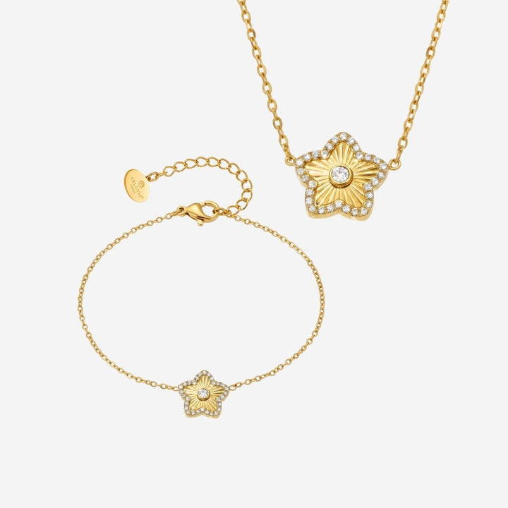 The Reve necklace and bracelet draws inspiration from the quiet poetry of a starlit bloom, radiant, graceful, and full of wonder. Encircled by a halo of glittering zirconia stones, the pendant’s centrepiece shimmers with a brilliant gem, mirroring a star cradled in a night sky. The surrounding details evoke harmony and movement, bringing depth and dimension to its refined design.