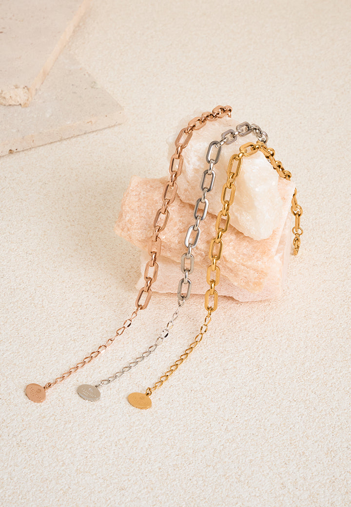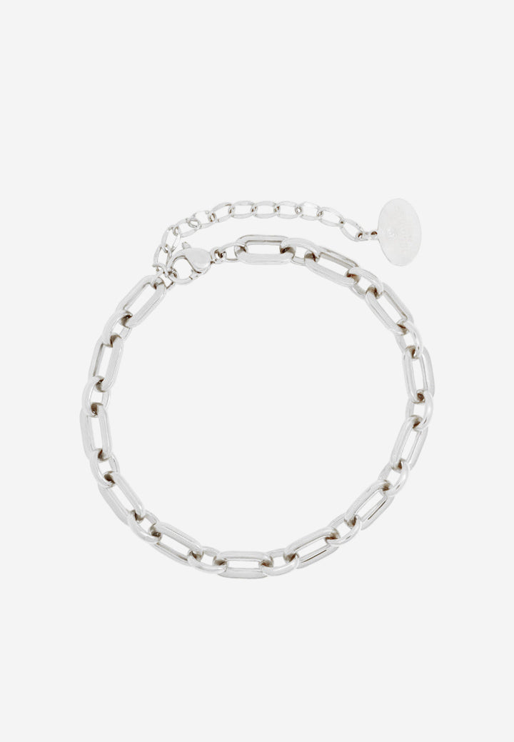 Designed with interlinked rectangular loops, Rue celebrates strength in symmetry. Its polished links mimic the rhythm of resilience: strong, soft, and endlessly fluid. Bold in structure yet smooth in intention, this bracelet reflects the confidence of a woman who supports herself.